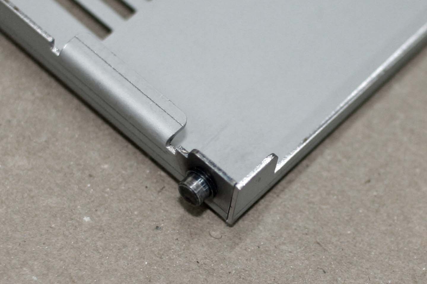 空気穴と市販のカギ取付穴が開いています。隅には協力会社で加工されたピンが溶接されており、サーバ本体に取り付けられた際にヒンジとなります。