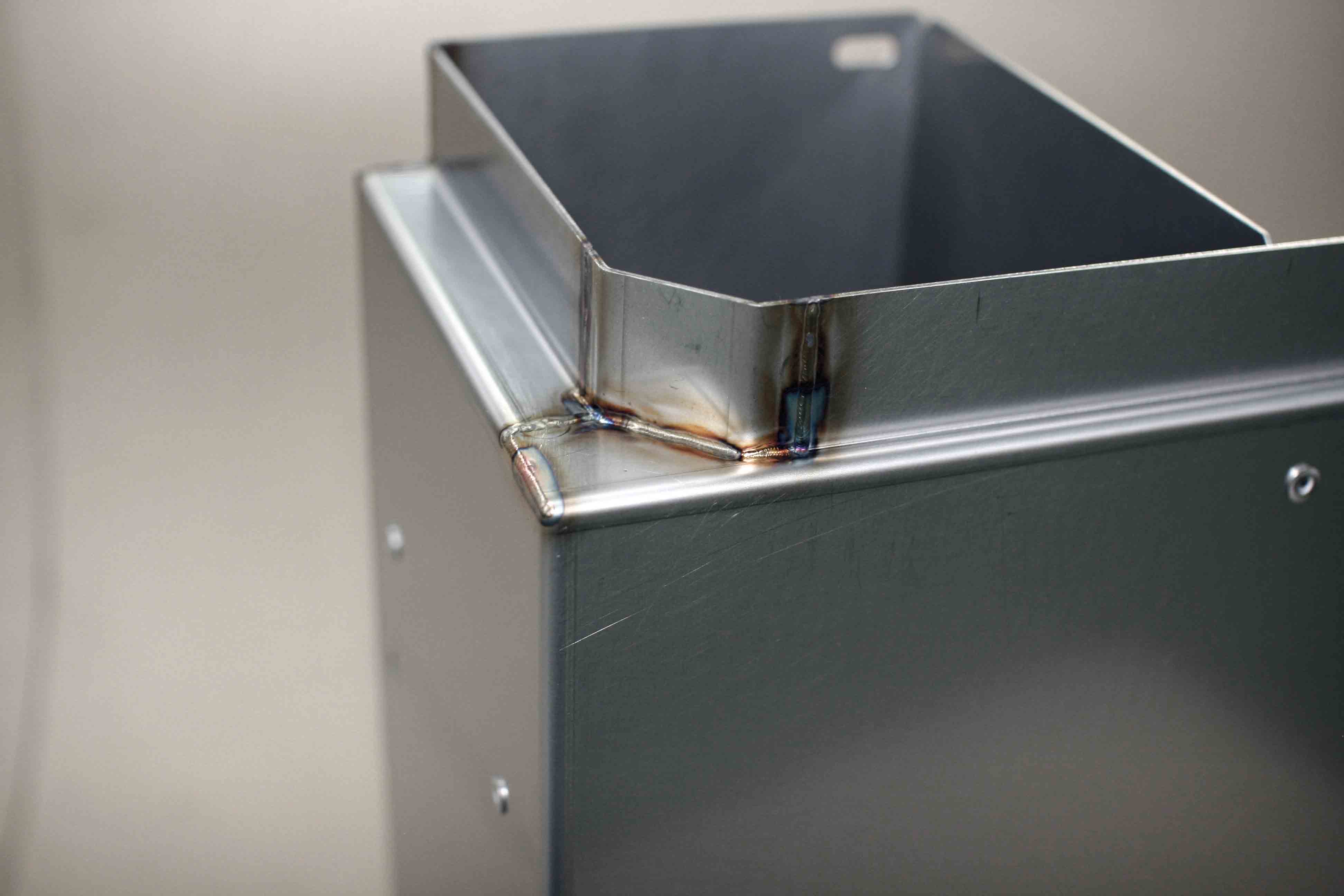 SUS304-2B材の全周溶接ボックスです。一般機械の中で冷却を担うため、ダクト形状になっており全周溶接構造です。あとから製品に内蔵されるため、幅の公差が±0.5mm以内ですが、量産にてその精度を確保しております。