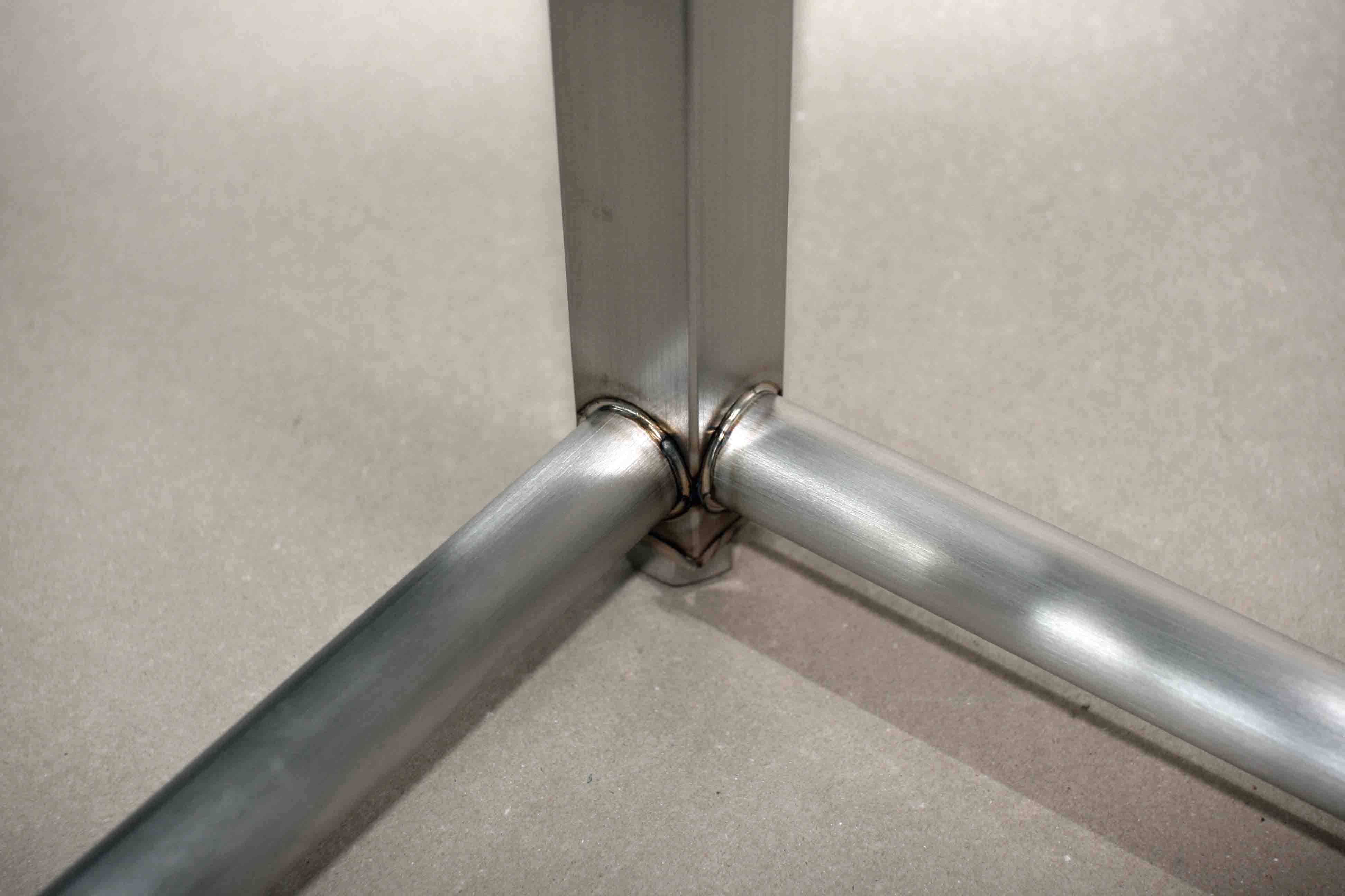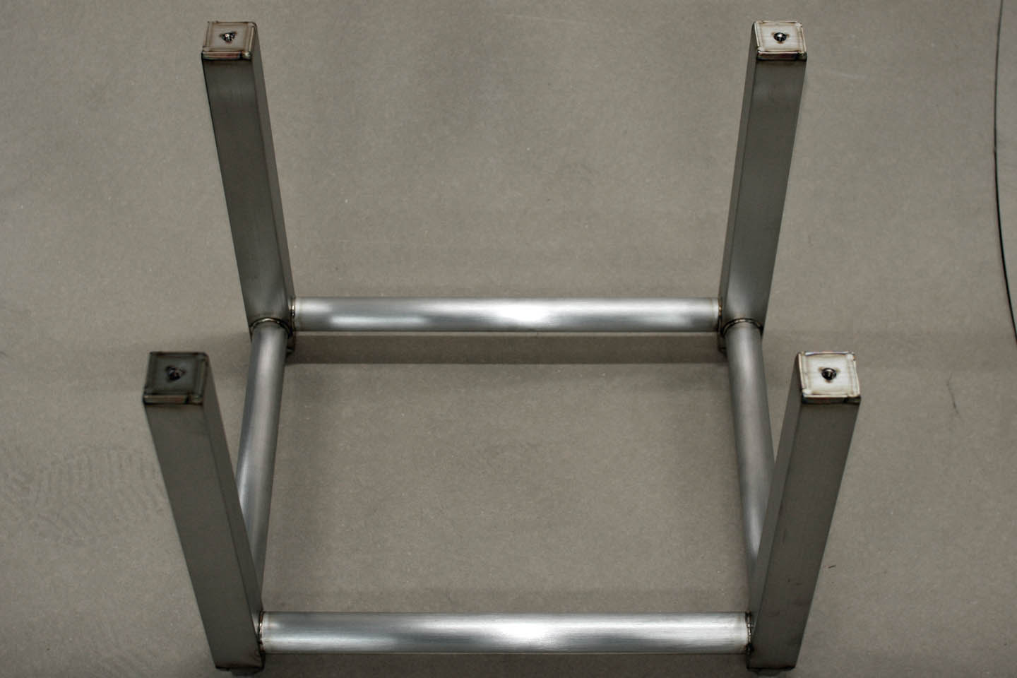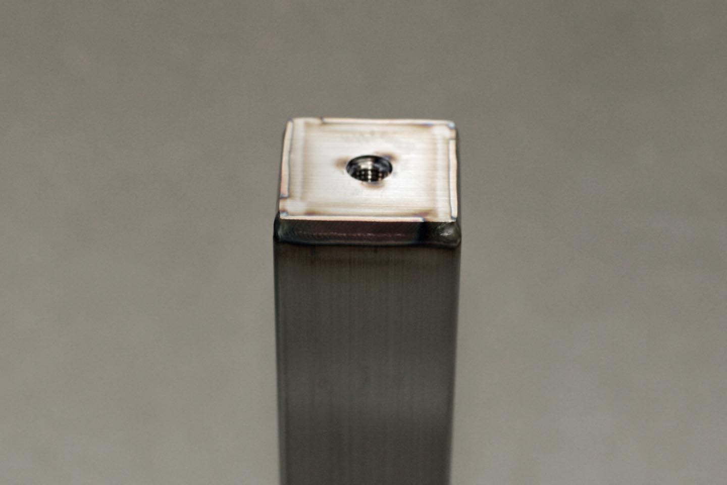 精密切断されたヘアラインステンレスパイプを溶接で組み上げたベースです。上部のM8ナットの中心公差は±0.5mm以内です。