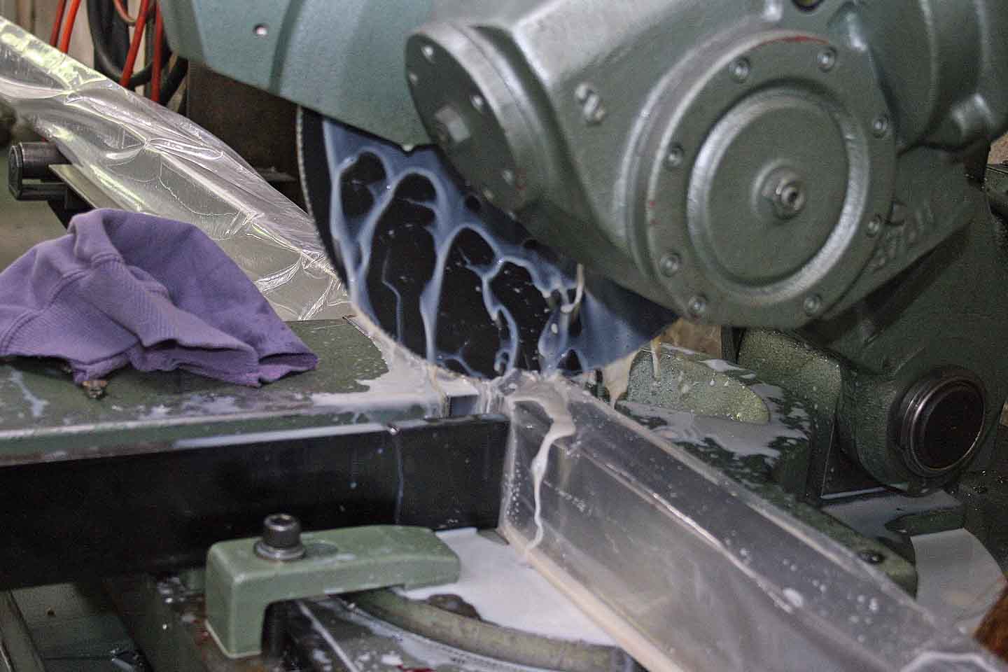 金属用の鋸刃を回転させてパイプやアングルを切断します。±0.3mmほどの精度を出すことができます。φ5の丸棒から75mm角のステンレスパイプまで幅広く精密切断することができます。